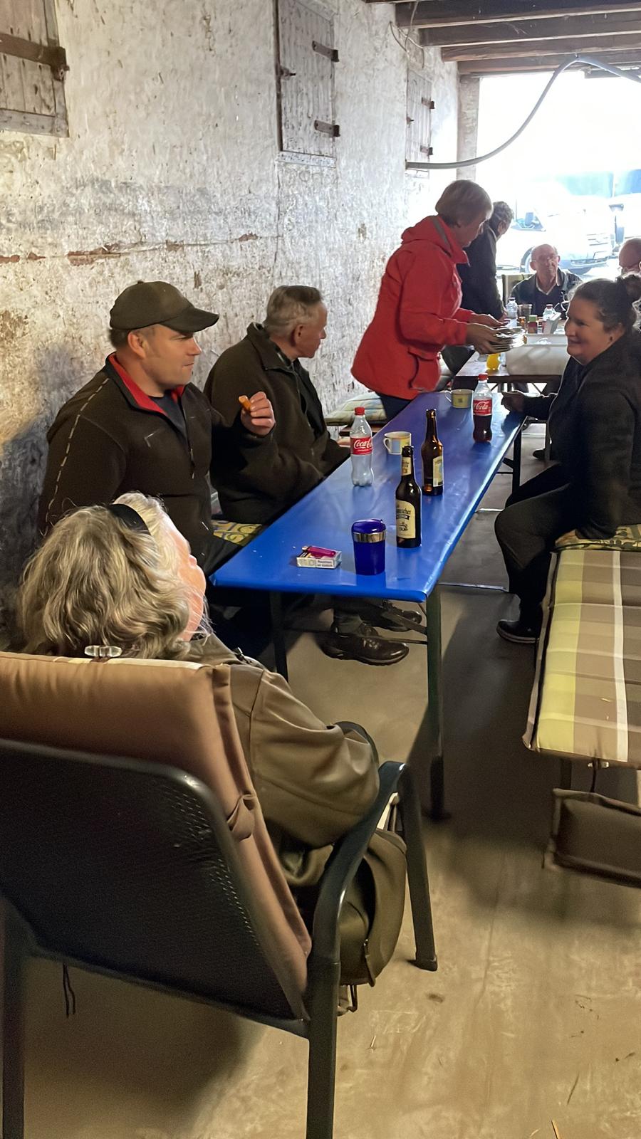 Weiter ging es zu den Gehorsamkeitsfächern Führigkeit( angeleint/frei), Ablegen und Schussruhe (angeleint/frei) und Benehmen auf dem Stand(angeleint/frei). Hier zahlte sich die gute Vorbereitung im Vorfelde aus und alle Gespanne konnten auch dieses Fach positiv abschließen. Dadurch, das die Prüfung so reibungslos und flott von statten ging, wurde kurzfristig entschieden, noch am selben Tag die Spurlautprüfung im Revier Österdeichstrich durchführen zu können. Hier wurden von den Richtern die Arbeit der Nase, der Spurlaut, der Spurwille und die Spursicherheit geprüft und bewertet. Am Tagesende waren alle Mitwirkenden durch nass und die Gummistiefel bis oben voll mit Marschboden aber alle glücklich und zufrieden. Spontan, wie wir Dithmarscher ja gerne sind, wurde am Jagdschlösschen von Jan Wilhelm Thedens in einer Halle Tisch und Bänke zusammen getragen und mit Genuss und viel Hunger Kartoffelsalat und Würstchen gegessen.